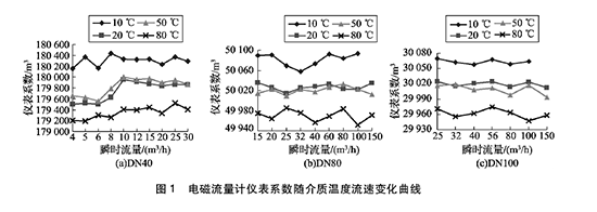由圖1可得:( 1)隨著介質(zhì)溫度的升高,廢水流量計的儀表系數(shù)均呈逐漸降低的趨勢。其中20℃和50℃的儀表系數(shù)基本相同,10℃和80 0C的儀表系數(shù)與20℃時偏離較大。(2)溫度對廢水流量計的儀表系數(shù)在高溫以及低溫處影響明顯,以D N40廢水流量計為例,儀表系數(shù)本次實驗高低溫處*大變化量約為0. 7% o ( 3)在廢水流量計相應(yīng)的流量范圍內(nèi),在同一溫度下,隨著介質(zhì)流速的變化,廢水流量計的儀表系數(shù)在個別點出現(xiàn)略微浮動,但整體變化不超過1 0. 2 %。