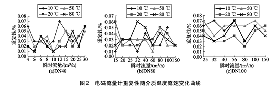 將實驗測得的廢水流量計在不同溫度及流速下的重復(fù)性數(shù)據(jù)整理,特性曲線如圖2所示,3組曲線分別對應(yīng)DN40, DN80, DN100的3塊廢水流量計的重復(fù)性曲線。