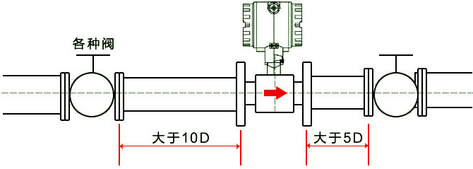 1、安裝時液體流動方向應與傳感器外殼上指示流向的箭頭方向一致,且上游直管段應≥20dn,下游直管段應≥5dn,其中dn為管道內徑。