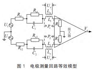 測量電極與流體介質接觸時會發生電化學反應在電極-溶液界面形成阻抗,通常由法拉*阻抗與雙電層電容并聯組成。 法拉*過程分為電荷傳遞過程和擴散過程,相應的法拉*阻抗由電荷傳遞電阻與擴散阻抗串聯組成。一般廢水處理流量計的勵磁頻率大于1Hz,而擴散阻抗發生在更低頻率內,不考慮擴散過程,電極等效阻抗為電荷傳遞電阻與雙電層電容并聯后再與電極接觸電阻串聯。 基于電極阻抗建立的電極等效測量回路如圖 1 所示。圖中:Rs1 和 Rs2 為電荷傳遞電阻;C1 和 C2 為雙電層電容;Rt為兩個測量電極間的接觸電阻滿足 Rt=Rt1+Rt2;Lx 為勵磁線圈等效電感;L1 為閉合回路等效電感;R1 和 R2 為放大器輸入電阻;P1和 P2 為由“變壓器效應”疊加在測量電極上的微分干擾;U1 為流體切割磁力線產生的感應電勢;Ue 為勵磁電壓。 假設磁感應強度由勵磁電流決定且成正比關系即 B=aI,忽略串模等干擾則電極間電壓為感應電勢與微分干擾的疊加,基本方程如下: