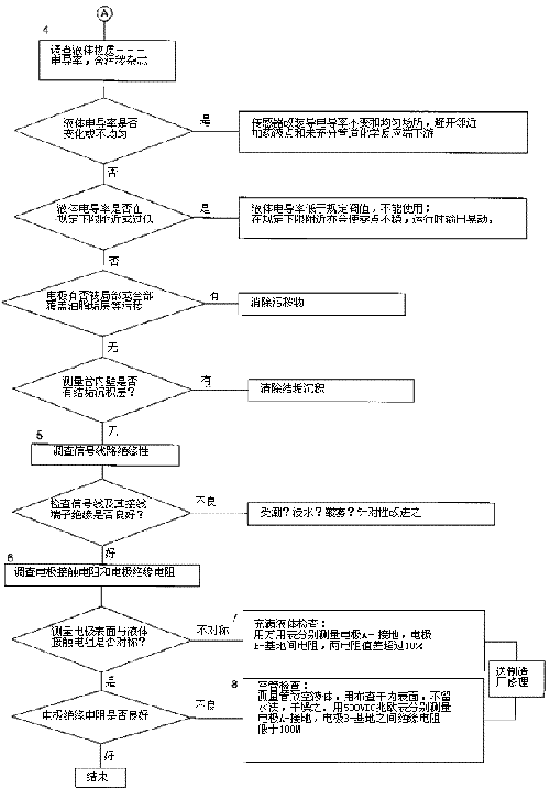 檢查流程圖*5項(xiàng)。信號(hào)回路絕緣下降會(huì)形成零點(diǎn)不穩(wěn)。信號(hào)回路絕緣下降的土要原因足,包極部位絕緣下降所引起的,但也不能排除信號(hào)電纜及其接線端子絕緣下降或破壞。因?yàn)橛袝r(shí)候現(xiàn)場環(huán)境十分嚴(yán)酷,稍一疏忽儀表蓋、導(dǎo)線連接處密封不慎,彌漫著潮氣酸霧或粉粒塵埃侵入儀表接線盒或電纜保護(hù)層,使絕緣卜降。信號(hào)回路絕緣電阻檢查分別按電纜側(cè)和流量傳感器側(cè)兩郵分進(jìn)行,用兆歐表測試。因信號(hào)電纜容易可先做。流量傳感器再分兩次進(jìn)行:充滿液體測黽電極表面接觸電阻和個(gè)管后測量,U極絕緣電阻。