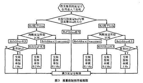 實際生產(chǎn)中流量一直在某個區(qū)域內(nèi)波動,且其動態(tài)特性不易掌握。從上面的理論中我們能夠讓誤差△£盡可能的小,這樣距我們所需要的理論值%就越接近。而減小誤差需要我們把n取的盡可能大,也就是在生產(chǎn)時間內(nèi)劃分更多的周期去調(diào)節(jié)流量。當工控機根據(jù)測濃硫酸流量計傳送回來的信號發(fā)出調(diào)節(jié)變頻器工作頻率的指令后,電機調(diào)整功率到測濃硫酸流量計的實際測量為一個工作周期,我們知道從指令發(fā)送到實際測量值返回有一個較大的滯后,如果調(diào)節(jié)的周期時間小于流量計本身的一個工作周期,那么顯然不可能達到減小誤差的目的。利用模糊控制思想H。,在控制程序中我們把流量的波動區(qū)域劃分為±缸×Yo,Yo-t-O.3,Yo±0.5四個區(qū)域,其中缸為可調(diào)節(jié)的誤差范圍,生產(chǎn)中我們?nèi)?.015,流量區(qū)域劃分的單位均為t/h。針對不同的區(qū)域采取不同的調(diào)整方案。具體流程如圖3所示。圖中變量Rel表示實際測量的流量,變量Idea表示理論流量。