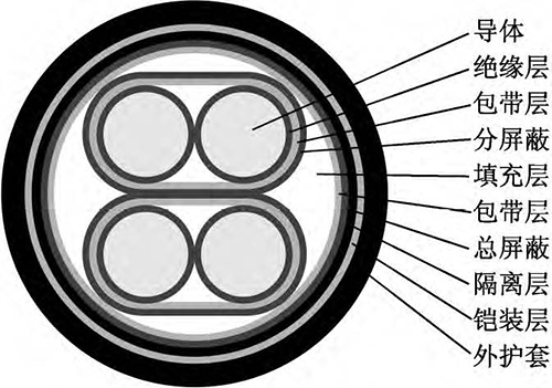 該新型電纜的結構如圖1所示。導體為單股退火鍍錫軟銅線,以提高導體的導電性和防腐蝕性。在導體外繞包一層薄F4(聚四氟乙烯)半導電帶,有利于降低導體和絕緣之間的摩擦起電噪音。絕緣采用材料較為純凈、介電常數較小、具有一定彈性的聚丙烯絕緣級材料,并采用擠壓式擠出,減小絕緣層與導體的間隙。采用對絞組作為信號傳輸線,由于在兩根傳輸線上感應的電壓接近相等,減小了電壓差值,提高了信號傳輸穩定性;對絞組由兩種不同顏色絕緣線芯組成,相鄰線對對絞節距應不大于100mm。對絞分屏蔽組(即對對絞組進行分屏蔽,每對對絞組外繞包兩層聚酯帶和一層厚0.04mm鋁塑復合帶繞包,內置一根7×0.26mm鍍錫銅絞線作引流線)有利于對不同對絞組之間信號串音的抑制和隔離。對絞分屏蔽組同心式絞合成纜,在對絞分屏蔽組間填充非吸濕性材料,以保證纜芯圓整。在成纜纜芯外繞包兩層聚酯帶,再采用鋁塑復合帶繞包,內置鍍錫銅線作引流線,以提高電纜電磁屏蔽能力。總屏蔽層外擠包隔離層(隔離護套),隔離層采用絕緣級低密度聚乙烯材料。隔離層外采用鎧裝層,鎧裝材料為高導磁合金鋼帶,其為強磁材料,可將外來的磁通大部分限制在鎧裝層的外表面上(僅有少部分能進入被屏蔽的空間);鎧裝時對高導磁合金鋼帶采用縱包焊接,確保其形成一連續圓柱管;鎧裝層可提高電纜抗電磁干擾水平以及對電纜進行加強,減少電纜振動引起的電動勢。外護套采用藍色軟PVC(聚氯乙烯)護層級電纜材料擠包,實現電纜防護。