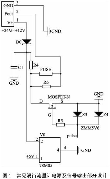 絕大多數(shù)的電磁干擾,都是通過(guò)電源線(xiàn)、信號(hào)線(xiàn)進(jìn)入到電子電路內(nèi),同樣,氮?dú)饬髁坑?jì)也是如此。圖 1 為常見(jiàn)氮?dú)饬髁坑?jì)電源及信號(hào)輸出部分設(shè)計(jì)。