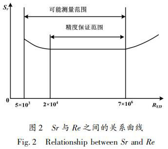 斯特勞哈爾數 Sr 與雷諾數 Re 之間的關系曲線如圖 2 所示。當阻流體尺寸確定后