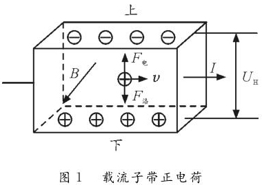 情形1:單種載流子。如圖1所示,若載流子帶正電荷,則載流子在洛倫茲力作用下會向下偏轉,導體下表面積累正電荷。同時,上表面失去正電荷而帶上負電,從而使下表面電勢高于上表面。