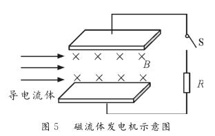 【例1】圖5為磁流體發電機示意圖。設兩金屬板間的距離為d,兩極板間勻強磁場的磁感應強度為B。等離子體垂直進入磁場的速度為v,單個離子所帶的電荷量為q。離子通道(即兩極板內所圍成的空間)的等效電阻為r,負載電阻為R。則下列判斷正確的是( )