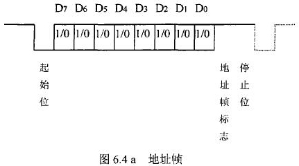 分體式電磁流量計等節點設備和站內PC機間的通信采用異步串行通訊控制規程,并采用地址位喚醒握手協議。因此在協議中規定了傳地址和傳數據兩種不同的幀格式,如圖.64所示。地址幀和數據幀由11位構成,幀格式為l位起始位,l位停止位,8位數據位,1位*9位。我們將*9位設定為“地址/數據指示位”,用來區分所發送/接受的幀信息是地址幀還是數據幀。*9位為1,表示PC機發送/接受的是“地址幀”*9位為O,表示主機發送/接受的是“數據幀”。命令幀與校驗和的發送格式與數據幀相同,因此可由數據幀演化得到。