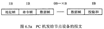 在分體式電磁流量計等節點設備和C機通信的過程中,由地址幀、命令幀、數據幀、校驗和可組成各種功能不同的報文。由于采用主從工作方式來實現通信,分體式電磁流量計等節點設備僅能接收并執行PC機發送來的控制命令,而不能發送命令給PC機。因此,由PC機發往流量計等節點設備的報文一般包括一個地址幀,一個命令幀,若干個數據幀和一個校驗和,其報文格式圖.6a5所示;而由流量計等節點設備發往PC機的報文一般包括一個地址幀,若干個數據幀和一個校驗和,其報文格式如圖6.5b所示。