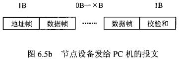 在飲用水流量計(jì)等節(jié)點(diǎn)設(shè)備和C機(jī)通信的過程中,由地址幀、命令幀、數(shù)據(jù)幀、校驗(yàn)和可組成各種功能不同的報(bào)文。由于采用主從工作方式來實(shí)現(xiàn)通信,飲用水流量計(jì)等節(jié)點(diǎn)設(shè)備僅能接收并執(zhí)行PC機(jī)發(fā)送來的控制命令,而不能發(fā)送命令給PC機(jī)。因此,由PC機(jī)發(fā)往流量計(jì)等節(jié)點(diǎn)設(shè)備的報(bào)文一般包括一個(gè)地址幀,一個(gè)命令幀,若干個(gè)數(shù)據(jù)幀和一個(gè)校驗(yàn)和,其報(bào)文格式圖.6a5所示;而由流量計(jì)等節(jié)點(diǎn)設(shè)備發(fā)往PC機(jī)的報(bào)文一般包括一個(gè)地址幀,若干個(gè)數(shù)據(jù)幀和一個(gè)校驗(yàn)和,其報(bào)文格式如圖6.5b所示。