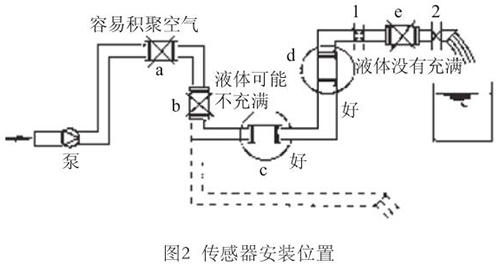 液體流動方向必須與傳感器殼體上箭頭方向一致。對于能正反向測量的液氮流量計,若方向不一致雖仍可測量,但設定的顯示流動正反方向不符,必須改正之。若拆傳感器工作量大,也可改變傳感器上箭頭方向和重新設定顯示儀表符號。管道未充滿液體主要是管網工程設計或傳感器安裝位置不妥,使傳感器測量管內不能充滿液體。應采取措施,避免安裝如圖2所示a,e位置和以虛線管排放時b位置,改裝到c,d位置。