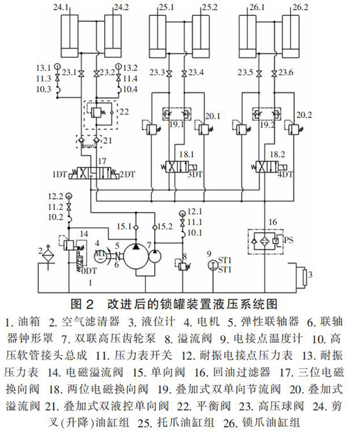根據氪氣流量計在整個提升系統中的實際工況,對該裝置的液壓系統進行技術改進,運用液壓集成技術,現代節能理念,采用機電液一體化思路,改進設計出的新型液壓系統如圖 2 所示。