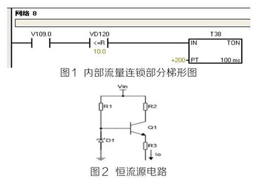 (2)PLC及模塊。PLC及模塊是自動化控制系統(tǒng)主要設備,且PLC及模塊屬于高集成高精密電子設備,保持室內整潔舒適,可以提高自動化系統(tǒng)運行穩(wěn)定性。PLC及模塊硬件運行可靠,內部控制程序是其控制核心軟件,如PLC硬件出現(xiàn)故障或損壞一般直接更換,但原內部控制軟件無法上傳,整個控制系統(tǒng)成失控狀態(tài)。所以其內部控制程序在調試驗收合格后應及時備份并做好標記,為以后修復PLC故障提供保障。PLC系統(tǒng)的維護技術人員需掌握一定基礎PLC控制邏輯原理,對準確判斷PLC故障點有很大的幫助。例如選礦廠水泵房S7-200系列PLC自動抽水系統(tǒng)出現(xiàn)如下故障 :觸摸屏能控制變頻器啟動水泵抽水,但在短時間內會自動停泵,導致無法正常抽水。通過故障現(xiàn)象可初步判斷PLC及模塊硬件設備正常,主要由于某個變量有問題導致連鎖停機。打開備份PLC控制梯形圖程序進行相關分析,原來是高溫液體流量計瞬時流量數(shù)值做了連鎖,其在一定時間內瞬時流量不大于10m 3 /h時,自動停泵,電磁流量模擬量輸出電流值僅為4ma且無變化,確定高溫液體流量計有故障。可臨時應急維修,模擬量模塊輸入模擬電流值10ma~20ma之間一固定數(shù)值即可恢復正常運行。制作簡單恒流源電路代替高溫液體流量計輸出的模擬電流量,實現(xiàn)解決水泵無法正常運行的故障。