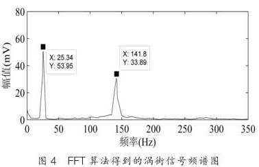 圖 4 是用 FFT 算法對渦街時域信號分析后得到的頻譜圖,其中渦街信號頻率為 141.8Hz ,振動噪聲信號頻率為 25.34Hz 。從圖中可以看出,信號是稀疏的,稀疏度 K=2 。