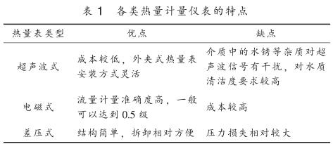 目前供熱行業(yè)內(nèi)使用的熱量計(jì)量?jī)x表按工作原理主要分為超聲波式、 電磁式、 差壓式, 其特點(diǎn)見(jiàn)表 1 。 熱量計(jì)量?jī)x表按結(jié)構(gòu)可分為一體式和分體式, 一體式熱量表將一支入口或出口溫度傳感器嵌入到流量傳感器管道中, 并配有專門的計(jì)算器進(jìn)行熱量計(jì)算; 分體式熱量表采用單獨(dú)的流量傳感器, 包括超聲波流量計(jì)、 電磁流量計(jì)、 差壓流量計(jì)、瀝青流量計(jì)等, 溫度測(cè)量采用單獨(dú)的鉑電阻溫度計(jì)或溫度變送器測(cè)量供回水管道溫度, 再配備熱量積算儀進(jìn)行溫度和流量信號(hào)采集得到熱量值。