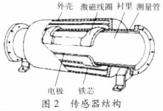 電磁流量計由流量傳感器和轉(zhuǎn)換器兩部分組成。傳感器典型結(jié)構(gòu)示意如圖2,測量管上下裝有激磁線圈,通激磁電流后產(chǎn)生磁場穿過測量管,一對電極裝在測量管內(nèi)壁與液體相接觸,引出感應電勢,送到轉(zhuǎn)換器。激磁電流則由轉(zhuǎn)換器提供。