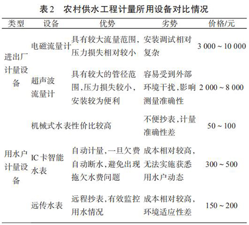 從現階段來看,農村供水工程進出廠水計量設備主要采取的為分體式電磁流量計、超聲波流量計,而用水戶計量設備主要包括機械式水表、IC卡智能水表、遠傳水表等。這些設備在實際使用過程中都有自身的優缺點,同時在價格方面存在較大差異,其具體情況如表2所示。