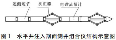 水平井注入剖面測井組合儀是針對水平井籠統(tǒng)注水井注入剖面測井專門研制的,儀器結(jié)構(gòu)如圖 1 所示。井下儀器主要包括通用短節(jié)( 遙測、溫度、壓力和 CCL) 、高壓電磁流量計和滾輪式扶正器。測量參數(shù)包括流量、溫 度、壓力、自然伽馬和深度。流量計采用的是非集流電磁流量計和集流型電磁流量計,對于注入量較大的井采用非集流電磁流量計,注入量較小的井采用集流型高壓電磁流量計,測量方式采用定點測量。儀器采用遙測技術(shù)實現(xiàn)了多參數(shù)同時測量和傳輸,儀器外徑 38 mm,耐壓80 MPa,耐溫150 ℃,流量測量范圍為1 ~ 800 m3 /d,測量精度 ± 5% 。