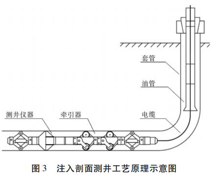 水平井注水井注入剖面測井工藝原理如圖 3 所示。在垂直井段,儀器在重力作用下可以通過注入管柱下入到井內(nèi),注入管柱下端須裝有喇叭口,且喇叭口應(yīng)在造斜點以上,保證測井完成后儀器順利起出,不發(fā)生卡儀器問題。儀器通過喇叭口以后在重力作用下繼續(xù)向下移動,當儀器不能靠重力下移時,啟動牽引器,利用牽引器將儀器推送到井底,上提電纜過程中進行測井。