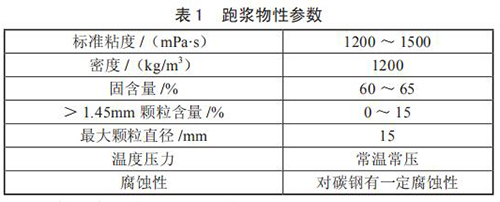 對跑漿進行分析后發現,跑漿是一種由煤漿和一些雜質混合而成的半流體物質,當管道蒸汽流量計使用煤倉中煤堆中上部煤時,由于煤質較好,跑漿中小煤塊極少,性質同正常煤漿,只是固含量稍高;而使用煤堆底部的煤時,煤質差管道蒸汽流量計研磨不充分,跑漿中含有約 15% 的小煤塊,分析后的跑漿物質參數如表 1 所示。