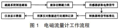 智能渦輪流量計的產生主要是基于法拉*電磁感應定律。在智能渦輪流量計的應用中,磁路系統會在流量計運行過程中逐步出現直流磁場與交流磁場,該磁場的產生為后期的測量提供了良好的前提條件,營造了測量所需的磁場環(huán)境,因此,在智能渦輪流量計應用時,一旦被測液體在導管中經過該磁場環(huán)境時,必然會產生一定的切割磁力線運動,在這種情況下,電極傳感器就會發(fā)揮其作用,將導管內的流量轉換為感應電勢信號,隨后此轉換形成的信號逐步被傳遞給轉換器。而轉換器更是可以將所獲得的流量信號等加以處理,通過分析、對比等,轉換器會將該信號變?yōu)闃藴市盘枺S后將該信號輸出給積算儀,進一步進行信號的處理,這些處理以后的信號*終會在智能渦輪流量計的儀表中顯示,呈現*終的流量測量結果,其基本的流程如圖 1 所示。