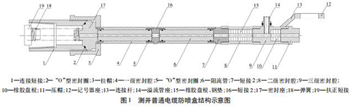 注入剖面測試中,溢流量對(duì)測量結(jié)果影響至關(guān)重要。如圖 1 所示,測井普通防噴盒采用 3 級(jí)密封: * 1 級(jí)密封為阻流管( 6) ,測 20 井次左右阻流管內(nèi)徑變大,溢流量增加; * 2 級(jí)為橡膠盤根和鋼墊( 15) ; * 3 級(jí)為橡膠盤根( 10) ,調(diào)整壓帽( 11) 松緊程度,橡膠盤根抱緊電纜; * 2 級(jí)和* 3 級(jí)密封更換一次橡膠盤根測試 3 ~ 5 井次溢流量增加。普通防噴盒無法實(shí)現(xiàn)溢流量,沒有捕捉器、防噴器和放噴組裝件。普通電纜防噴裝置工作壓力20 MPa,耐壓 40 MPa。