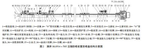 如圖 2 所示,DLFP14 - 70T 注脂防噴盒有 1 個(gè)注脂口、1 個(gè)回脂口、1 個(gè)防噴盒液控口、1 個(gè)刮纜器液控口及1 個(gè)溢流口,主體內(nèi)裝有 6 根阻流管。DLFP14 - 70T 注脂防噴盒采用 4 級(jí)密封: * 1 級(jí)密封采用注脂密封,撬裝注脂泵從注脂口注入高壓高粘度密封脂于 6 根阻流管與電纜間隙; * 2 級(jí)密封采用液壓密封,氣動(dòng)液壓泵主加壓和手壓泵補(bǔ)加壓結(jié)合從防噴盒液控口注入液壓油,推動(dòng)活塞擠壓膠芯壓筒; * 3 級(jí)密封采用液壓密封,手壓泵加壓從刮纜器液控口注入液壓油,推動(dòng)活塞擠壓膠芯壓筒實(shí)現(xiàn)密封和刮油作用; * 4 級(jí)密封油杯、橡膠盤根和刮油環(huán)( 鋼 墊) 。DLFP14 - 70T 注脂防噴裝置配有液控上、下捕捉器、液控雙閘板防噴器和放噴組件,根據(jù)實(shí)際可以調(diào)整溢流量,實(shí)現(xiàn)零溢流密閉測井施工。 DLFP14 - 70T 注脂防噴裝置工作壓力 70 MPa,耐壓105 MPa。