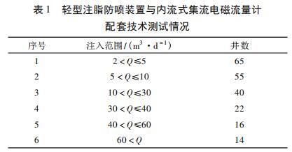 在實(shí)際應(yīng)用中,使用輕型注脂防噴裝置與內(nèi)流式集流智能型渦輪流量計(jì)配套技術(shù)對(duì)喇叭口在射孔層上注聚井進(jìn)行測試。輕型注脂防噴裝置與內(nèi)流式集流智能型渦輪流量計(jì)配套技術(shù)施工工藝參見文獻(xiàn),測試情況見表 1 所示,低注入量井( ≤10 m3 /d) 占到 56. 60% 。
