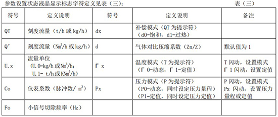 (3)標(biāo)況流量計(jì)算公式(若補(bǔ)償后單位為 U.0):(4)標(biāo)況流量計(jì)算公式(若補(bǔ)償后單位為 U.1):注:標(biāo)況指 20℃,1 標(biāo)準(zhǔn)大氣壓三、一體化液晶顯示表頭參數(shù)設(shè)置操作說(shuō)明(V03Z)1、鍵盤(pán)按鍵說(shuō)明2、 顯示窗字符說(shuō)明注:表中 x 代表“0”或“1”;Zn:標(biāo)準(zhǔn)狀態(tài)下(20℃,1 標(biāo)準(zhǔn)大氣壓),被測(cè)氣體的壓縮系數(shù),Z:工作狀態(tài)下被測(cè)氣體的壓縮系數(shù)3、 操作說(shuō)明3.1、本儀表表頭采用自導(dǎo)引式和菜單式相結(jié)合的參數(shù)設(shè)置方式,所謂自導(dǎo)引式參數(shù)設(shè)置方式就是用戶在進(jìn)入菜單 00 項(xiàng)后,表頭中的微電腦會(huì)自動(dòng)導(dǎo)引用戶去設(shè)置需要設(shè)置的參數(shù)。另外,用戶也可以通過(guò)菜單模式分別對(duì)各組參數(shù)進(jìn)行設(shè)置。蒸汽測(cè)量菜單框圖如下:3.2、參數(shù)設(shè)置約定:在設(shè)置各項(xiàng)參數(shù)時(shí),提示符閃動(dòng)代表該項(xiàng)參數(shù)沒(méi)有設(shè)置完或者尚未確認(rèn),可以通過(guò)按SET 鍵來(lái)確認(rèn)或者按→鍵退出;提示符不閃動(dòng)代表該項(xiàng)參數(shù)已設(shè)置完并確認(rèn),此時(shí)可以通過(guò)按 SET 鍵翻頁(yè)或者按→鍵退出。進(jìn)入?yún)?shù)設(shè)置時(shí),需要輸入密碼(6 位)并確認(rèn)進(jìn)入,為了防止誤進(jìn)入?yún)?shù)設(shè)置菜單,保證儀表正常工作,在設(shè)置密碼時(shí),使用↑鍵調(diào)數(shù)時(shí)不能循環(huán)調(diào)數(shù),只能單次調(diào)數(shù),只有密碼輸入正確進(jìn)入各項(xiàng)參數(shù)設(shè)置菜單后才可以對(duì)各位循環(huán)連續(xù)調(diào)整數(shù)據(jù)。3.3、儀表參數(shù)設(shè)置舉例:儀表出廠前各項(xiàng)參數(shù)已設(shè)置好,用戶無(wú)需設(shè)置。如果用戶需要設(shè)置某項(xiàng)參數(shù),請(qǐng)參照以下步驟,例如修改刻度流量值 QT:在工作狀態(tài)下,按 SET 鍵,顯示屏顯示 P,數(shù)字位為全零,8 秒鐘若無(wú)操作,自動(dòng)返回工作狀態(tài)。輸入密碼 :按數(shù)字↑鍵和左移←鍵,輸入密碼數(shù) xxxxx(出廠時(shí)默認(rèn)密碼為 000123),↑鍵調(diào)各位數(shù)字 0-9,每按 ←鍵一次數(shù)字向右循環(huán)一位,可通過(guò)多次按←鍵對(duì)整段數(shù)字清零,按→鍵可以返回工作狀態(tài)。菜單選擇項(xiàng):按 SET 鍵確認(rèn),顯示屏顯示如右圖所示,末行“00”閃動(dòng)調(diào)整該項(xiàng)值選擇不同參數(shù)設(shè)置菜單。該例直接按 SET 鍵進(jìn)入菜單 00 項(xiàng)設(shè)置刻度流量:QT 閃動(dòng),*一步:*先進(jìn)行小數(shù)點(diǎn)調(diào)整,可以通過(guò)←鍵對(duì)參數(shù)快速清零或者通過(guò)↑鍵進(jìn)行小數(shù)點(diǎn)調(diào)整,調(diào)整完畢,按 SET 鍵確認(rèn)(QT 仍閃動(dòng));*二步:數(shù)值調(diào)整,可以通過(guò)↑鍵對(duì)每位數(shù)字進(jìn)行調(diào)整,按 ←鍵一次數(shù)字向右移動(dòng)一位,調(diào)整完畢,按 SET 鍵確認(rèn),QT 停止閃動(dòng),該項(xiàng)參數(shù)設(shè)置完畢,可進(jìn)行下一項(xiàng)參數(shù)設(shè)置或者退出另外,單位設(shè)置 U.X 和補(bǔ)償方式設(shè)置 dX 通過(guò)↑鍵調(diào)整修改。3.4、校驗(yàn)項(xiàng)說(shuō)明: 儀表出廠前,溫度和壓力通道已校驗(yàn)設(shè)置好,無(wú)需用戶重新校驗(yàn)。校驗(yàn)通道有密碼保護(hù),廠家不對(duì)外開(kāi)放,如果需要重新校驗(yàn)溫度或者壓力通道,請(qǐng)專業(yè)人員與廠家技術(shù)人員聯(lián)系。4、計(jì)算公式說(shuō)明4.1、蒸汽測(cè)量計(jì)算公式(1)渦街流量?jī)x表工況體積流量計(jì)算公式:(2)密度 d,單位 Kg/m3(3)質(zhì)量流量計(jì)算公式,單位 Kg/h:(4)質(zhì)量流量計(jì)算公式,單位 t/h:4.2、氣體測(cè)量計(jì)算公式----標(biāo)況指 20℃,1 標(biāo)準(zhǔn)大氣壓(1)渦街流量?jī)x表工況體積流量計(jì)算公式:(2)對(duì)比壓縮系數(shù) d(Zn/Z),單位 1(3)標(biāo)況流量計(jì)算公式,單位 Nm3/h:P1—工況絕壓,PN—標(biāo)況絕壓(Mpa),T1—工況熱力學(xué)溫度,TN—標(biāo)況熱力學(xué)溫度(K)