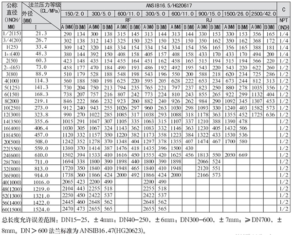 壓力等級(CL/MPa):150/2.0、300/5.0、600/11.0、900/15.0、1500/26.0、2500/42.0