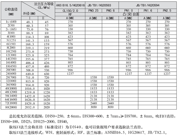1.總長度允許誤差范圍:DN50-250,±6mm;DN300-600,±7mm;≥DN700,±8mm。吹掃口直徑:DN50-100,DN25;DN125-3000,DN40。
