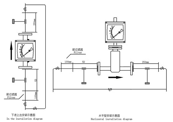 3.指針浮子流量計有垂直安裝和水平安裝形式,如果是垂直安裝形式,安裝垂直度應該保證優于1%,如果是水平安裝形式,安裝水平度都應該保證優于1%。