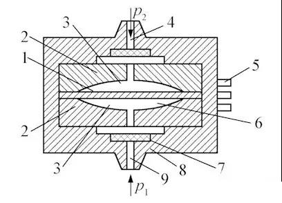 1—金屬膜片(動極);2—凹玻璃圓盤;3—金屬鍍層(定極);4—低壓側(cè)導(dǎo)壓口;5—輸出端子;6—空腔;7—過濾器;8—殼體;9—高壓側(cè)導(dǎo)壓口