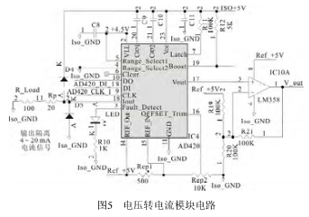 IC4(AD420)是一塊電壓轉電流模塊,可將電壓信號轉換成電流信號輸出,輸出電流范圍是4~20mA或0~20mA,其后面可以接模擬指示儀表。接其后面可以接模擬指示儀表。接在其輸出端的IC10(LM358)是運放,可將輸出電流轉換成電壓輸出,電壓輸出范圍流轉換成電壓輸出,電壓輸出范圍0~10V。電路如圖5所示。