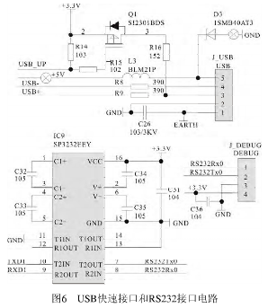 由Q1、R14、R15、R16、L3、D3、R8和R9等元件組成的電路與單片機對應電路,組成等元件組成的電路與單片機對應電路,組成USB快速接口電路??焖俳涌陔娐贰C9(SP3232EEY)芯片與周圍元)芯片與周圍元件組成RS232接口電路。電路如圖6所示。
