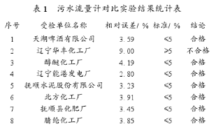 根據(jù)化工污水流量計(jì)選型的校驗(yàn)標(biāo)準(zhǔn),撫順市安裝的化工污水流量計(jì)選型運(yùn)行比較正常可做對(duì)比試驗(yàn)的有14臺(tái),對(duì)這14臺(tái)流量計(jì)分別進(jìn)行了對(duì)比試驗(yàn)。測(cè)試方法是采用標(biāo)準(zhǔn)儀器對(duì)所監(jiān)測(cè)的流量計(jì)進(jìn)行8h的連續(xù)平行監(jiān)測(cè),從試驗(yàn)結(jié)果中選出被檢流量計(jì)*大流量范圍的五點(diǎn)對(duì)比數(shù)據(jù)和累計(jì)流量對(duì)比結(jié)果,相對(duì)誤差小于5%的為合格。此次實(shí)際測(cè)試的有:撫順縣化肥廠、北方化工廠、撫順?biāo)喙煞萦邢薰尽⑦|寧能港發(fā)電廠、醇醚化工廠、遼寧華豐化工廠、天湖啤酒有限公司、腈綸化工廠8家企業(yè)。飛利鋁材、汽車鋁輪轂、老虎臺(tái)礦、石油一廠新廠因?yàn)闊o水未測(cè)試,石油二廠新排污口、乙烯化工廠因?yàn)槿鄙倭髁坑?jì)廠方配合未能測(cè)試。測(cè)試結(jié)果除華豐化工廠流量計(jì)相對(duì)誤差大于5%不合格外,其他均合格,見表1。